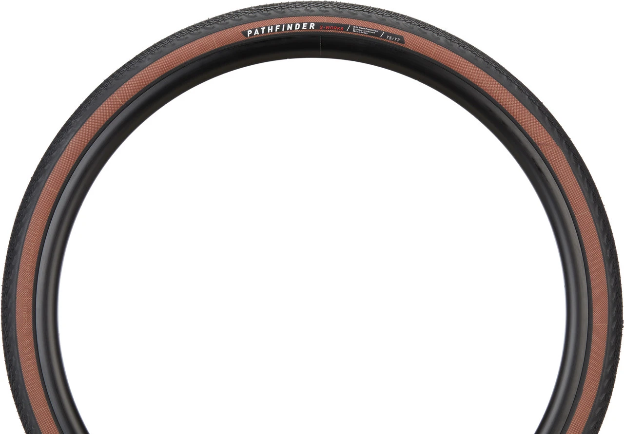 Der S-Works Pathfinder von Specialized ist ein besonders leichter und besonders schneller 28″ -Gravelreifen für den Einsatz auf Schotter, Asphalt und in leichtem Gelände. Er zeichnet sich im Vergleich zur Pro-Version durch ein feineres Profil aus, was Gewicht spart und der Geschwindigkeit zugutekommt. Dennoch sorgen die griffigen Schulterbereiche für zuverlässigen Halt auf losem Terrain. Bei der Gummimischung setzt Specialized auf das aus dem MTB-Sport bekannte GRIPTON®-T5- und T7-Dual-Compound, das Vibrationen dämpft, dadurch stabilisierend wirkt, zugleich aber leicht abrollt. Die 120-tpi-Nylonkarkasse mit Grid-Race-Pannenschutztechnologie und BlackBelt bietet Sicherheit und eine geschmeidige Fahrt sowohl abseits wie auf der Straße. Es kommen zusätzliche Polyamidfäden zum Einsatz, die sehr verschleiß- und durchschnittfest sind, wenig wiegen und mit ihrer Elastizität für ein direktes Feedback sorgen. So bist Du auch im Renneinsatz vor unliebsamen Überraschungen optimal geschützt und profitierst zugleich von einem optimalen Abrollverhalten. Der S-Works Pathfinder kommt mit einer klassischen braunen Seitenwand und kann ohne Schlauch gefahren werden.