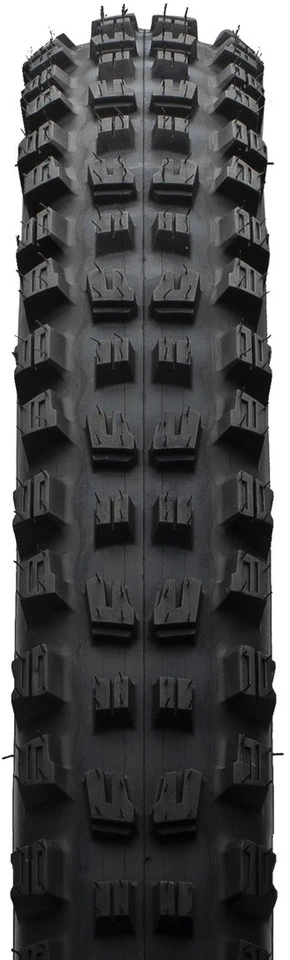 Das aggressive Profil mit tiefen Lamellen und abgestuften Vorderkanten an den Mittelstollen rollt gut ab, packt bei Anstiegen zuverlässig zu und gibt seitliche Stabilität.